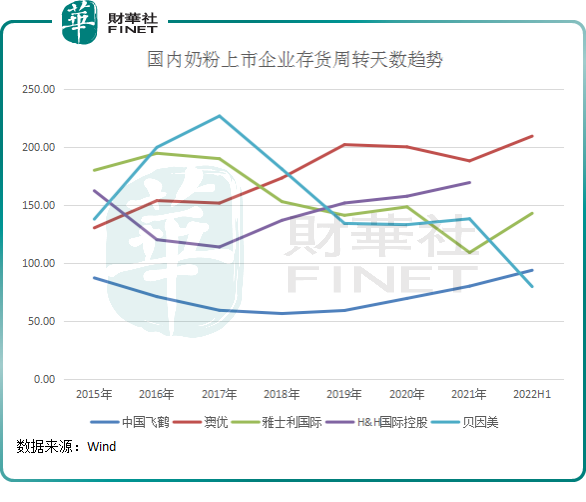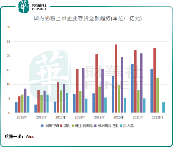 Wind数据显示,在2022年中期,澳优和雅士利存货金额均处于历史高位,占总资产比重分别为24.23%及17.92%,达到或接近上市以来的最高水平。