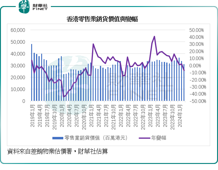 政府统计处的数据显示,2024年3月本港零售业总销货值按年下降6.95%,至311.91亿港元,是疫情于2022年末结束以来的首个月下降,见下。