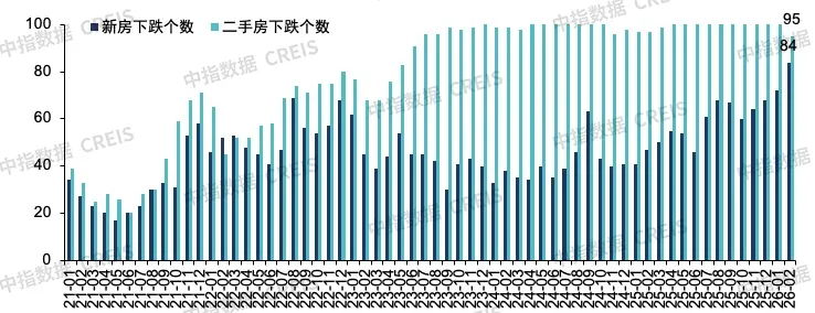 图:百城新建住宅、二手住宅价格环比下跌城市数量变化