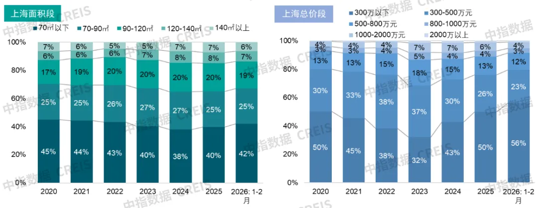北京、上海小户型、低总价二手房仍是成交主力。当前大城市的刚需及刚改购房者普遍通过购买二手房解决居住问题,而新房市场则转向满足改善性需求。2026年1-2月,北京、上海70平米以下二手房成交占比分别提升至39%、42%。同时随着房价持续调整,市场房源整体向低总价段回落,1-2月北京、上海300万以下二手房成交套数占比较2025年分别提升5个、6个百分点,成交套数同比增长13%、25%。