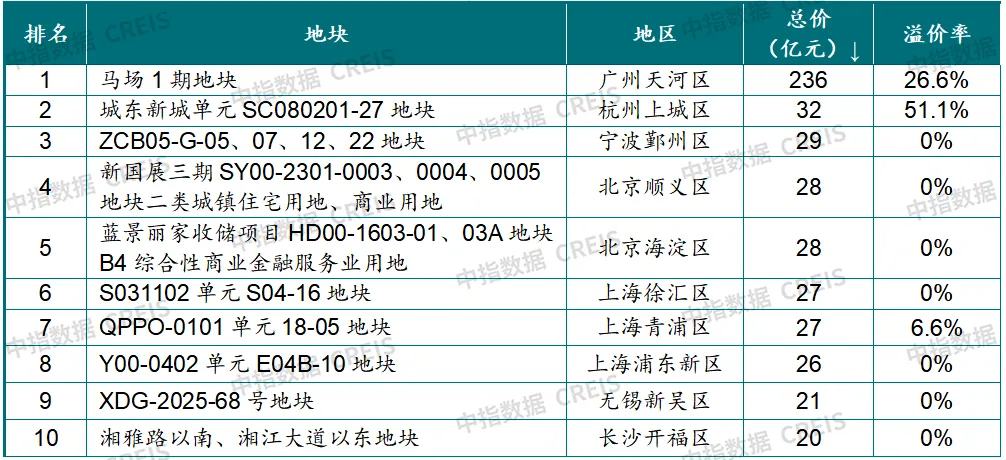 从城市集中度来看,根据中指数据,2026年一季度(截至3月28日),全国TOP20城市宅地出让金占全国比重为60%,较2025年全年提升8个百分点。全国住宅用地出让金排名靠前的城市中,多为核心一二线城市。年初以来,重点城市土拍活动较少,其中广州在天河区马场地块(总价236亿元,由越秀获取)带动下,跃升一季度全国土地出让金首位;上海、北京土地市场相对平稳,出让金在百亿元左右,南通宅地出让金达114亿元,更多为地方国资获取。