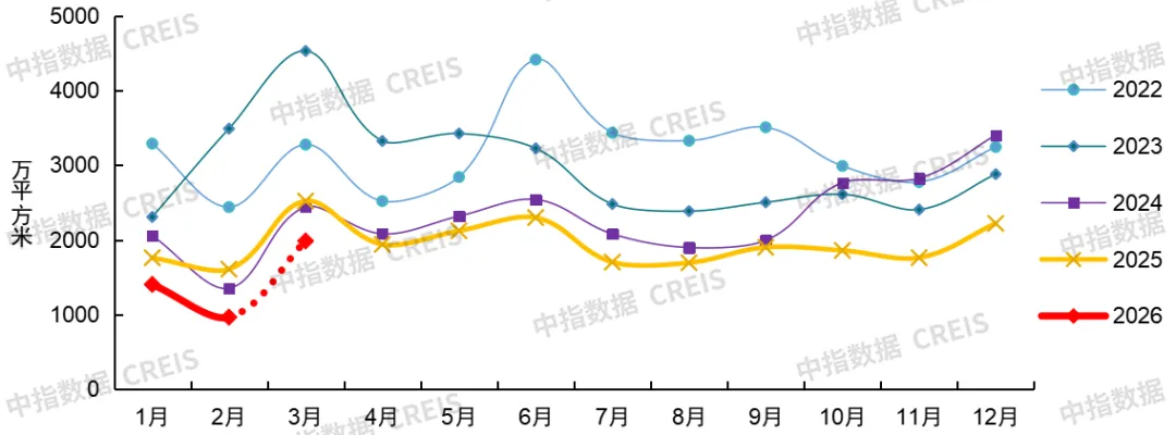 新开工:2026年1-2月,全国房屋新开工面积同比下降23.1%,延续低位运行态势。去库存背景下,房企资金压力及拿地意愿偏弱是制约开工修复的主要因素。从土地端来看,作为住房供应的源头,土地成交持续缩量也对新开工形成传导影响。短期新开工规模预计将延续低位运行态势。
