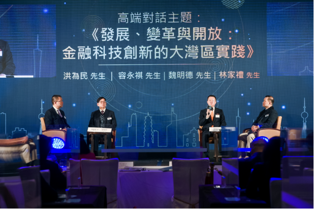 高端對話環節:全國人大代表、前海管理局香港事務首席聯絡官洪為民教授,JP,全國政協經濟委員會副主任、香港專業及資深行政人員協會創會會長容永祺先生,SBS,MH,JP,全國政協委員、安德資本主席、香港金融發展協會主席魏明德先生,以及麥格理基礎及有形資產大中華及東盟區非執行主席、香港數碼港管理有限公司董事局主席林家禮博士,BBS共同圍繞「發展、變革與開放:金融科技創新的大灣區實踐」進行了深入探討。