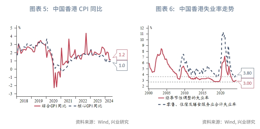 第二季度以來,特區政府支持樓市和旅遊業的措施有利於内需復蘇和樓市成交回暖;但資本市場仍然受到經濟復蘇強度和持續性,以及海外流動性雖邊際放松但利率絕對水平維持高位的影響,居民財富效應尚未釋放,疊加歐美需求有所轉弱,預計將令GDP增速有所放緩。年初以來香港通脹壓力維持較輕水平;本地就業市場整體穩健、失業率仍處歷史低位,但值得注意的是,隨著本地零售、旅遊業增速放緩,相關行業失業人口小幅反彈。