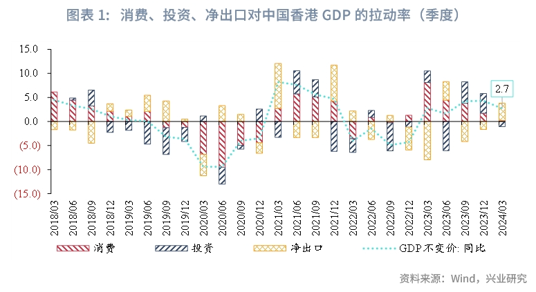 2024年以來中國香港經濟延續溫和復蘇,第一季度GDP同比增長2.7%、連續5個季度同比正增長;按季環比升幅加大至2.3%、連續3個季度正增長。分項看,香港第一季度私人消費開支同比升1%,增幅由2023年第四季度的3.5%明顯收窄;本地固定資本形成總額同比僅升0.3%(前值+17.5%)。服務輸出同比升8.1%(前值+21.2%);貨品出口總額同比升幅則由前值的2.8%加快至6.7%。