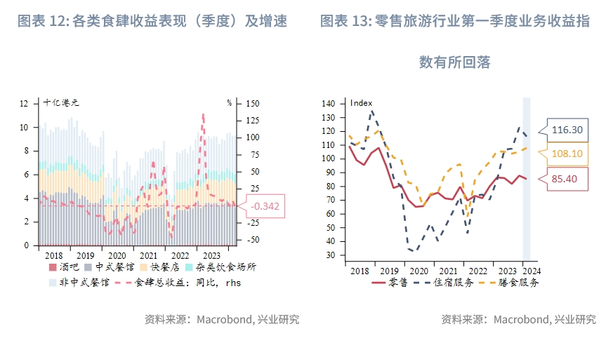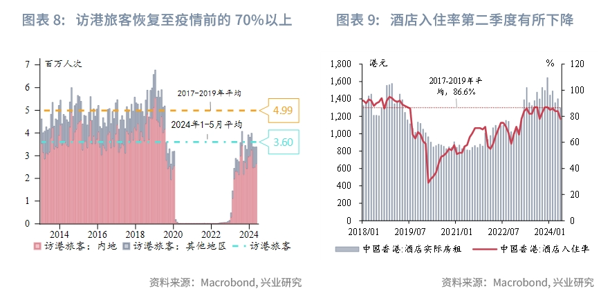展望下半年,本地需求延續溫和增長,但在2023年高基數影響下,相關行業對本地經濟的拉動預計將進一步減弱。年初以來市場對美聯儲首次降息時點延後的預期令財富效應釋放進一步減緩,零售業或於第三季度繼續承壓。政策方面,香港特區政府順應消費旅遊模式的轉變、於《2024-2025年度財政預算案》(《財政預算案》)中提出了多項支持旅遊業的措施,包括支持舉辦不同範疇的旅遊、體育及財經金融盛事活動等。自5月末起,内地增開8個城市赴港澳「自由行」,當前赴港澳「自由行」城市增至59個,涵蓋全國所有省會城市;此外,内地旅客到港購物免稅額自7月1日起提升至12000港元;相關措施均有望為訪港旅遊及消費提供一定支撐。