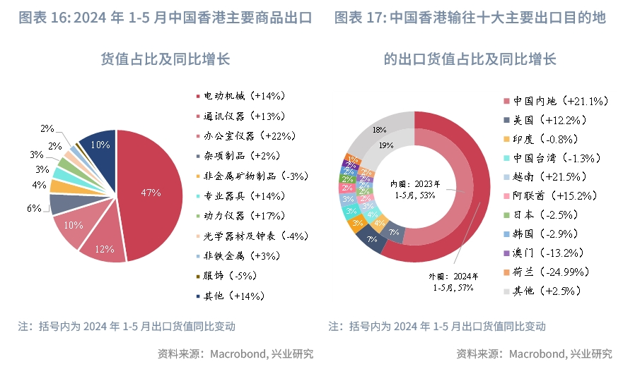 2024上半年香港進出口表現優於預期、主要受到電子產品需求增長帶動。今年1-5月累計,香港整體出口貨值同比上升12.5%、進口貨值同比升7.4%,一定程度上受到2023年較低基數的影響(2023年全年出口、進口分别下跌7.8%、5.7%)。按產品類别看,1-5月香港出口主要由電子產品帶動,期間電動器械、通訊儀器及辦公室儀器三類產品出口貨值合計同比增長15.2%、合計佔比超過香港總出口貨值的70%。按地區來看,1-5月香港對内地的出口同比增長21.1%;對東盟的出口上升19.8%、其中對越南的出口增加21.5%。内地和東盟生產設施對電子零部件的需求大增是令香港電子產品業表現向好的主要原因。相比之下,香港對印度(同比-0.8%)、中國台灣(-1.3%)的出口有所下降;對日本出口同比下跌2.3%,主要受到日元兌美元匯率下跌影響。1-5月香港對中東出口同比攀升14.9%、該地區對各類消費品需求均較為旺盛。