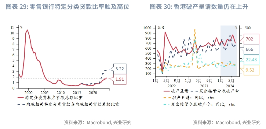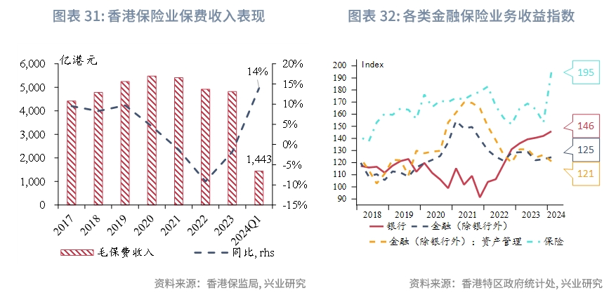 2024上半年高息環境下香港繼續吸引存款流入、但信貸需求仍然疲弱,内地來港投保帶動保險業明顯回溫。銀行業方面,截至2024年5月底,香港認可機構存款總額較2023年底累計增長3.2%,其中外幣存款同比增速仍高於港幣存款。但同時,5月末香港銀行體系貸款總額較2023年底累計下降2.4%,令5月末香港銀行業貸存比降至59.41%、為十四年來最低水平。值得注意的是,本地樓價下跌、零售旅遊業面臨旅客消費習慣的調整,均令本地相關行業企業破產數量上升,疊加香港銀行業對内地房企的敞口風險仍待消化,繼續令銀行業資產質量承壓。香港金管局數據顯示,零售銀行體系特定分類貸款比率(不良貸款率)截至2024年第一季度末報1.91%、較2023年底再升0.24個百分點,創2005年第一季度以來的新高;與内地相關的特定分類貸款比率由2023年底的3.17%上升至3.24%,再創2015年有記錄以來最高。保險業方面,隨著内地居民在港投保需求延續釋放,第一季度香港保險業毛保費同比增加14%至1443億港元、其中内地訪客新造保單保費同比升63%至156億港元;第一季度保險業業務收益指數也顯著走升,高於銀行、資產管理等行業。