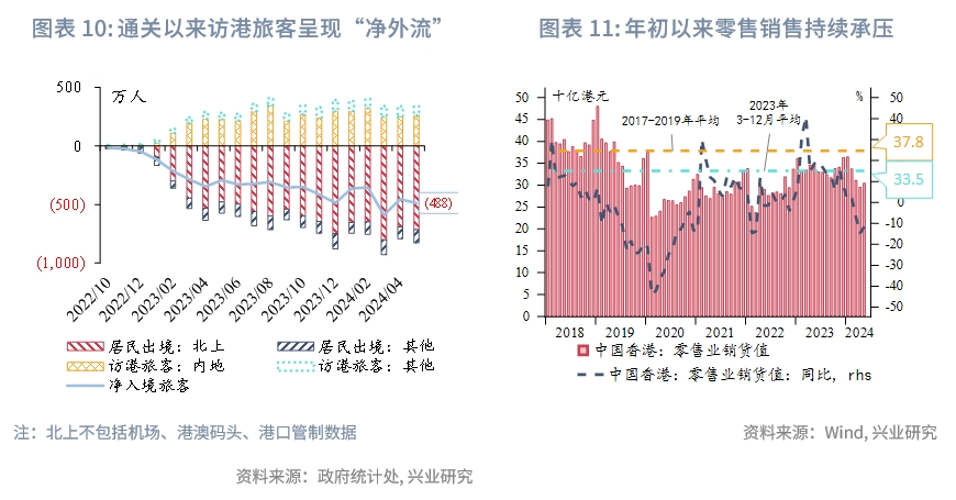 2024上半年香港消費旅遊行業延續溫和改善、第二季度有所承壓。今年1-5月訪港旅客平均人次恢復至新冠疫情前70%以上的水平,酒店入住率、酒店平均房租也基本恢復至2018年水平。但同時,本地居民「北上」内地或海外旅遊增多,持續帶來旅客「淨外流」。今年1-5月,香港居民經主要口岸「北上」累計出境人次為3511萬、居民總出境人次為4048萬,同期訪港旅客入境總人次為1802萬,僅為香港居民「北上」人次的44%(2023年該比例為47%)。此外,隨著低基數效應的減退,香港零售業銷貨值增速自2023年11月以來逐步放緩,並於2024年3月起同比轉跌。
