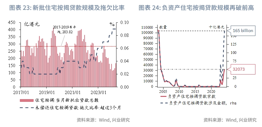 展望下半年,美聯儲有望開啓降息周期,但絕對利率水平仍高,高息環境或繼續抑制地產成交回暖,本地住宅售價預計全年仍將錄得跌幅,租賃市場下半年則有望延續活躍。截至2024年第一季度末,香港未來3-4年一手住宅潛在供應量約為11.2萬個、創歷史新高;在此背景下,開發商低價推售新盤尾貨,對二手樓市交易價格造成擠壓的趨勢料將延續。同時,即便美聯儲第三季度末開啓降息,由於港元利率滞後於美元利率波動、本地銀行業也往往滞後於香港金管局調降與按揭貸款利率掛鈎的最優惠貸款利率(Prime Rate)、或令樓市潛在買家繼續觀望。值得注意的是,樓價下跌背景下香港住宅按揭負資產、按揭貸款拖欠比率或維持高位,需關注對銀行業資產質量的影響。此外,今年1-5月香港私人住宅租金指數累計升1.6%,特區政府推出的人才計劃及留學生來港持續帶來住宅租賃需求、預計將繼續支持住宅租賃市場升溫。