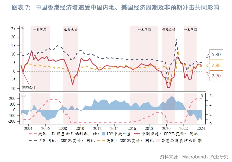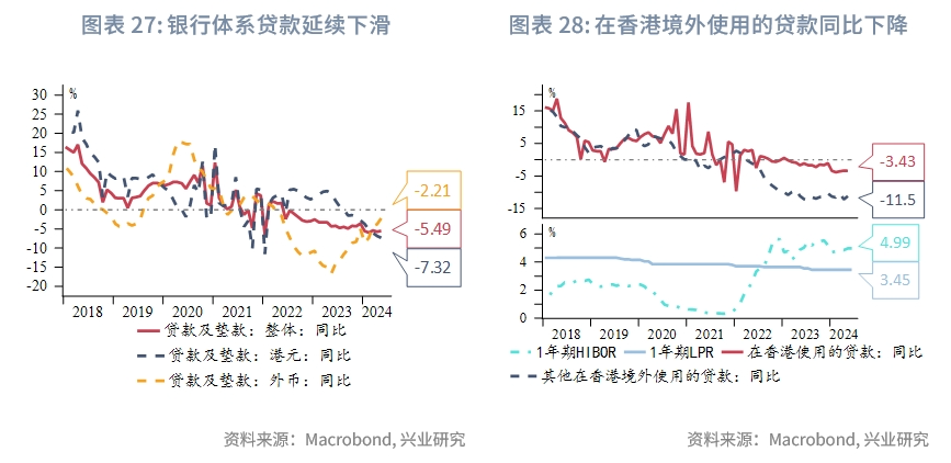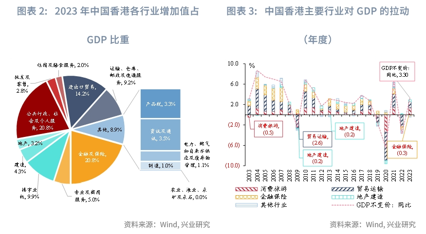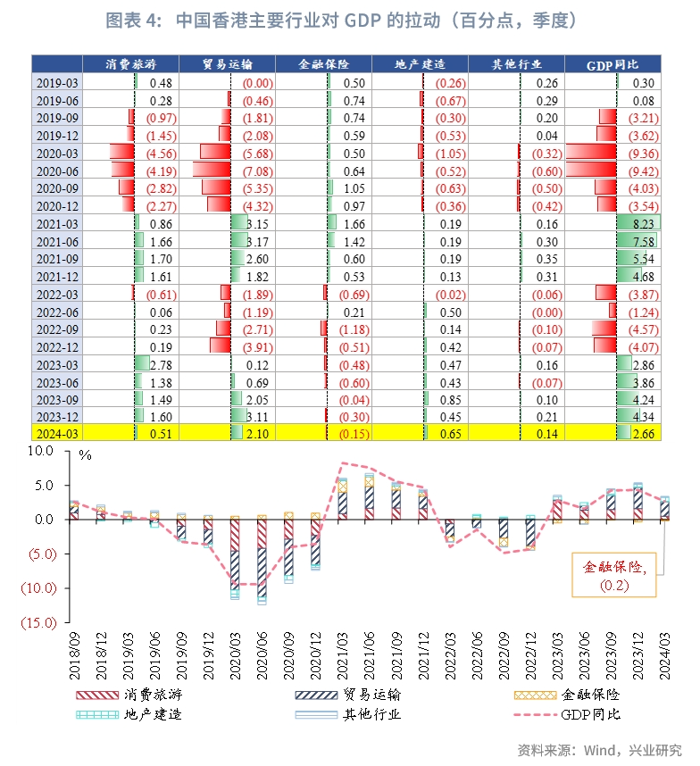 展望下半年,隨著美聯儲降息路徑逐步明朗,信貸需求有望逐步釋放、緩解不良資產壓力,資本市場交投活躍度上升也有望帶動銀行非息收入增長。一方面,在降息落地前,本地高利率預計繼續抑制企業和居民的融資需求,與内地利差的倒掛也將繼續抑制在港中資企業信貸需求,香港銀行業信貸規模增長料仍承壓,預計第四季度將有所好轉。另一方面,4月以來港股資金面壓力有所緩解、内地房地產行業支持政策密集落地,疊加内地與香港提出多項優化互聯互通、提振港股流動性的措施,帶動港股交投活躍度開始修復,也有望支持香港銀行業資本市場相關非息收入的修復。整體來看,金融保險相關行業在下半年預計延續緩慢復蘇,最早於第四季度有望重新實現對經濟增長的正向拉動。