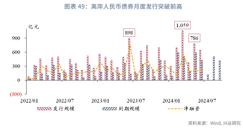 後續看,一方面,若美聯儲9月如期降息,中資美元債融資成本有望繼續回落、利好一級市場發行及二級市場表現,但仍需注意美國大選及地緣博弈等因素的擾動;此外,内地房地產政策密集期過後,市場樂觀情緒將逐步回歸理性,地產中資美元債後續表現有待進一步觀察。另一方面,中美利差倒掛預計仍將持續一段時間、疊加人民幣匯率雙向彈性有所增強,料繼續支持點心債市場規模的擴大。