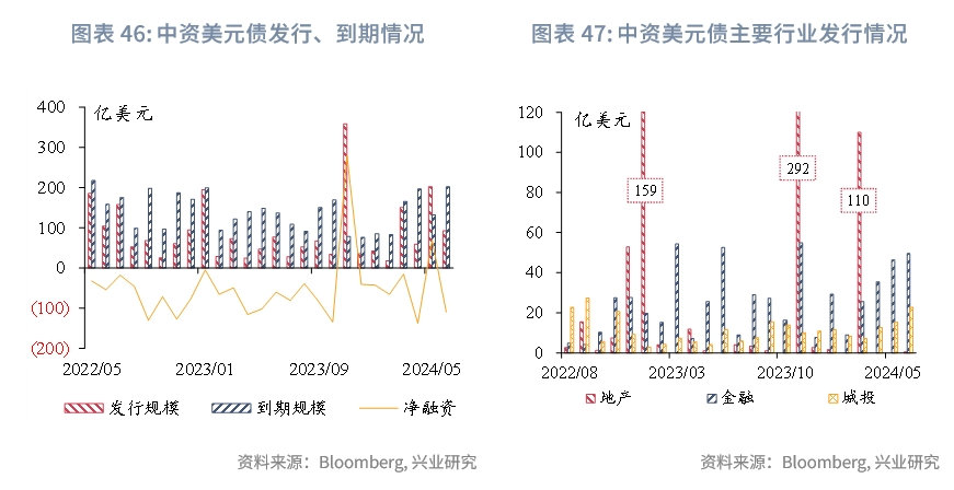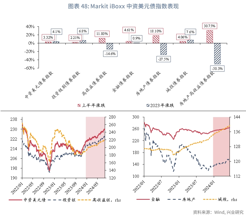 2024年上半年中資美元債市場發行回暖、二級市場由跌轉升。上半年内地經濟復蘇、地產及城投風險有序化解背景下,中資美元債發行整體改善,但美聯儲首次降息時點預期延後、中美利差維持倒掛,仍然抑制中資美元債發行意願。上半年中資美元債發行規模同比增長27%至564億美元;其中地產、金融、城投債發行額同比分别變動-36.31%、11.66%、117.87%。二級市場隨著外圍風險偏好的回暖、内地房地產利好措施密集出台而整體修復,高收益級整體跑赢投資級,整體回報指數累計上升3.3%。上半年離岸人民幣債發行規模創歷史新高。上半年離岸人民幣債券[6]發行持續放量、累計發行規模達3860億元,同比增長22%、並已達到2023年發行總額的64%;其中,3月離岸人民幣債券發行規模約1059億元(排除同業存單)、突破了2023年6月的歷史前高。年内財政部在香港發行230億元離岸人民幣國債,發行期限以中長期為主;截至6月底,離岸人民幣國債存量總額約1195億元。同時,隨著城投化債政策逐步推進,城投企業境外融資需求有所回升,在「借新還舊」驅動下,城投點心債發行規模有所改善。