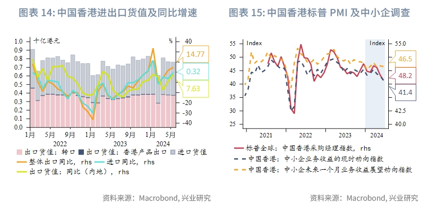 展望下半年,歐美經濟體需求逐漸轉弱,美國大選增加外貿不確定性,可能帶來「搶出口」,香港貿易出口短期内預計保持韌性,但後續增長面臨挑戰。下半年歐美主要經濟體逐漸由主動補庫過渡至被動補庫階段,外需逐漸減弱。短期内,全球半導體銷售在2023年11月同比轉正、並於2024年上半年延續升勢;美國半導體產業協會近期將全年全球半導體銷售增速預期從13.1%上調至16.0%。半導體銷售增勢預計在今年下半年維持、繼續帶動香港電子產品的出口。香港貿易發展局(貿發局)第二季度出口信心展望指數[3]由第一季度的47.4上升至54.3,反映香港貿易商對未來短期出口前景較樂觀。但同時,地緣政治局勢緊張仍有可能為香港貿易活動帶來衝擊;例如,美國提出根據301條款、自8月起對來自中國内地的電動車和多類其他商品加徵關稅,歐盟委員會於7月4日起對來自中國内地的電動車徵收臨時反補貼稅等舉措,或對經由香港的相關行業轉口貿易產生影響、進而影響香港整體出口表現[4]。整體來看,中國香港2024年進出口貨值全年有望錄得10%左右的增幅。