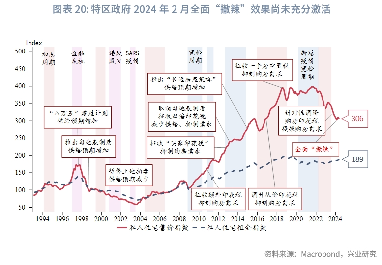 2024上半年香港「撤辣」短期刺激地產市場成交、但樓價仍承壓。2月底《財政預算案》宣佈全面取消所有額外購房印花稅、面向本地及非香港居民實施統一購房稅率[5],相關措施落地後明顯提振了3-4月住宅市場交投;上半年香港住宅樓宇買賣合約量同比增加5.9%,但成交金額同比仍微跌0.2%。同時,開發商低價推售積壓新盤,本地住宅市場供應充足、資本市場波動施壓收入預期等因素仍掣肘樓價反彈,1-5月香港私人住宅售價指數累計跌1.7%,自2021年的歷史高位累計下跌約23%。
