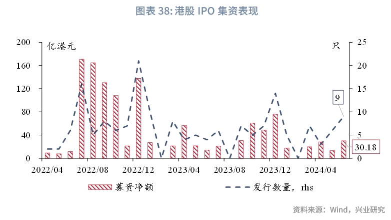 一級市場,2024年上半年港股IPO活動維持淡靜、仍缺乏大型新股支持。上半年港股主板共有30只新股上市、募資淨額共計約109.4億港元,同比分别下跌3.2%、22.2%。上半年上市新股中,僅2只募資淨額超過10億港元;根據德勤數據,港交所第一季度集資額排名跌至全球第10位。但從新股認購情況來看,上半年新股中有14只有效認購倍數超過100倍,反映投資氛圍整體升溫。下半年,積極政策有望支持港股一級市場回暖。4月,中國證監會與港交所推出多項促進内地與香港資本市場合作的措施,其中提及支持内地行業龍頭企業赴香港上市;同月,港交所在《主板上市規則》中新增「18C」機制,為特專科技公司降低了上市門檻,進一步拓寬了市場的融資渠道。截至7月19日,港交所處理中的主板、創業板(GEM)上市申請有102只,其中包括周六福、合眾新能源汽車、曹操出行、美的集團等大型公司。