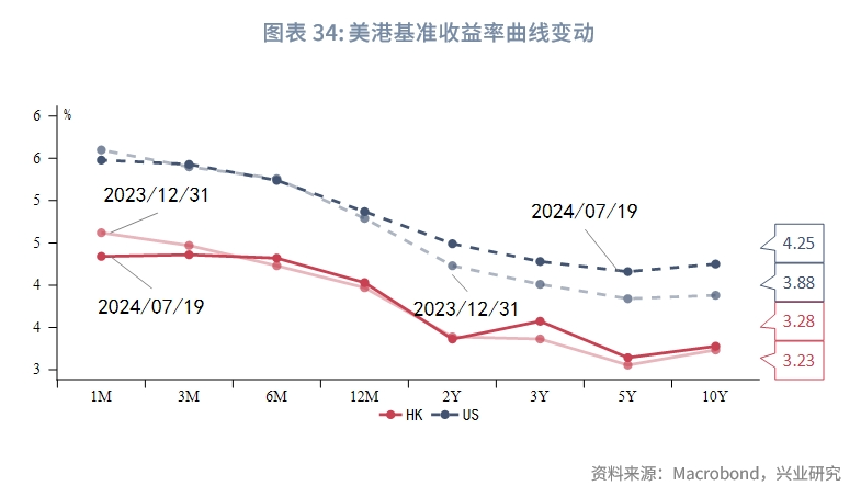 步入下半年,隨著市場對美聯儲9月降息預期逐步升溫,聯系匯率制度下,年底前香港金管局或跟隨美聯儲調降1-2次貼現窗基本利率;由於港元利率相對滞後於美元利率波動,美港息差有望於第三季度末起由正轉負,帶動港元匯率進一步穩定在7.75-7.80區間。