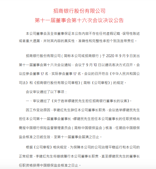因工作變動原因,李建紅辭任招商銀行董事長職務,會議選舉缪建民擔任公司第十一屆董事會董事長。缪建民擔任董事長的任職資格尚需報中國銀行保險監督管理委員會(簡稱中國銀保監會)核准,任期自中國銀保監會核准之日起生效,至第十一屆董事會屆滿之日止。