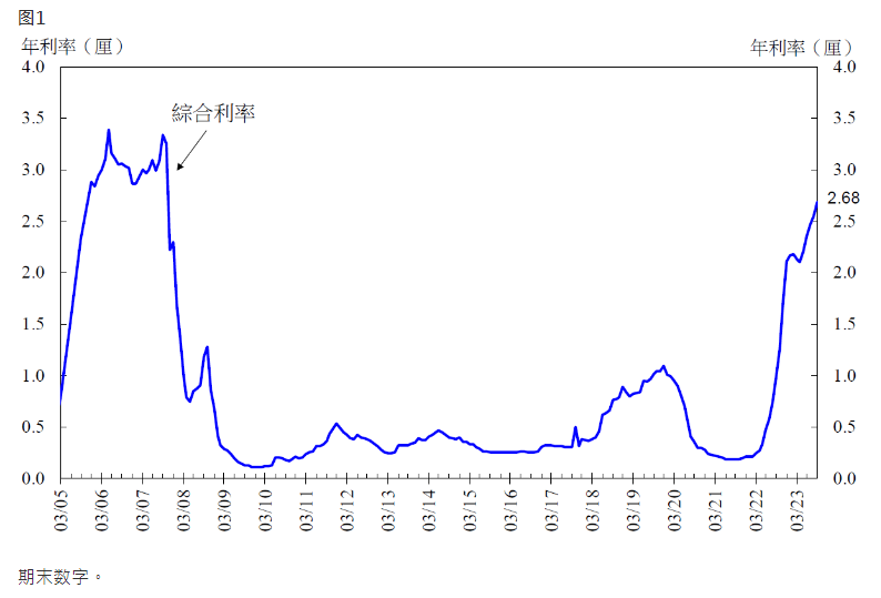 10月19日,香港金管局今日公布9月底的綜合利率。反映銀行平均資金成本的綜合利率在2023年9月底為2.68厘,較2023年8月底的2.55厘上升13基點。綜合利率上升,反映月內存款及銀行同業資金的加權資金成本增加。
