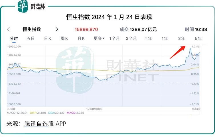 受此消息帶動,港股1月24日尾盤忽然急拉,見下圖。