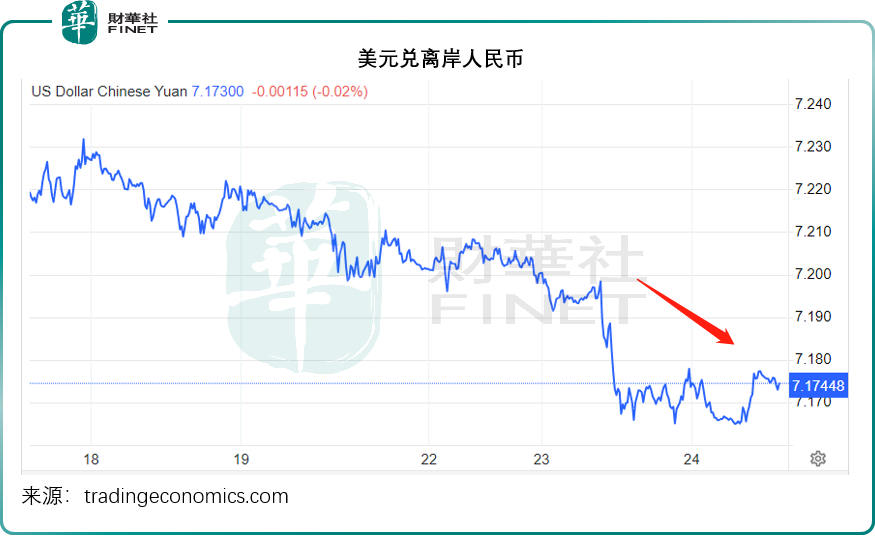 離岸資金馳援的消息,或也帶動離岸人民幣兌美元匯率上漲,兌美元匯價已超越7.18,見下圖,在一周前,離岸人民幣兌美元還在7.23以上——注:數值越低,1美元能兌換的離岸人民幣越少,意味著離岸人民幣兌美元走強。