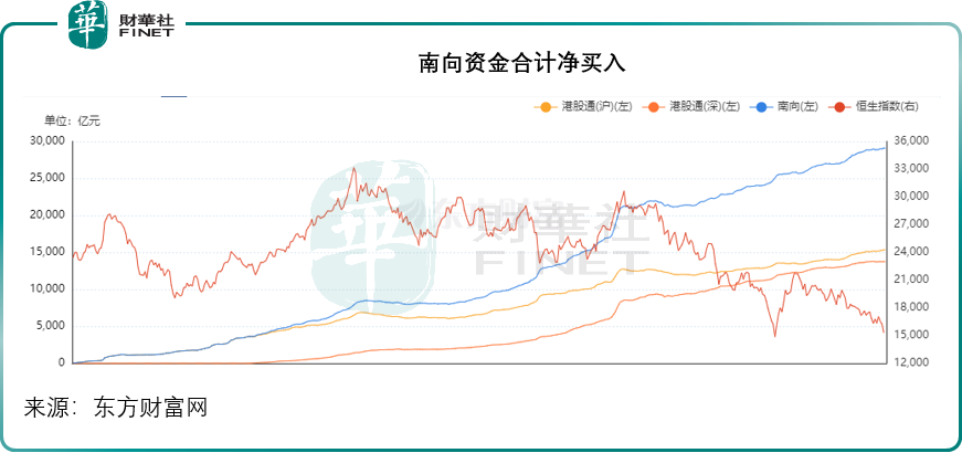 從目前港股市場的資金走向來看,南向資金在繼續增援,見下圖,恒生指數持續向下,而南向資金依然在攀升。但從港股市場的整體日成交量來看,未算太活躍,外資似乎仍按兵不動。
