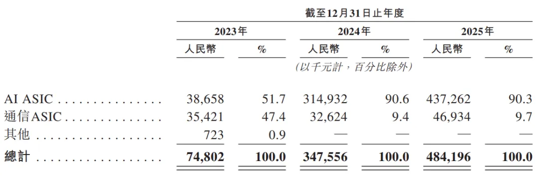 按應用類型劃分,AI ASIC相關收入是最主要的收入來源,2024年和2025年佔比均超過90%。
