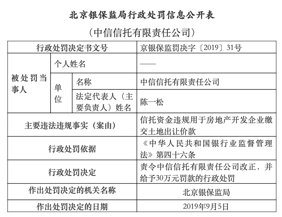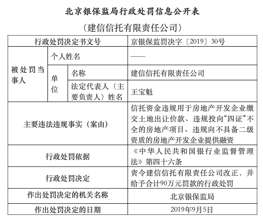 9月11日,北京銀保監局公布了多張罰單,中信信托、建信信托兩家信托公司也在其中。此次作出處罰決定日期為9月5日。