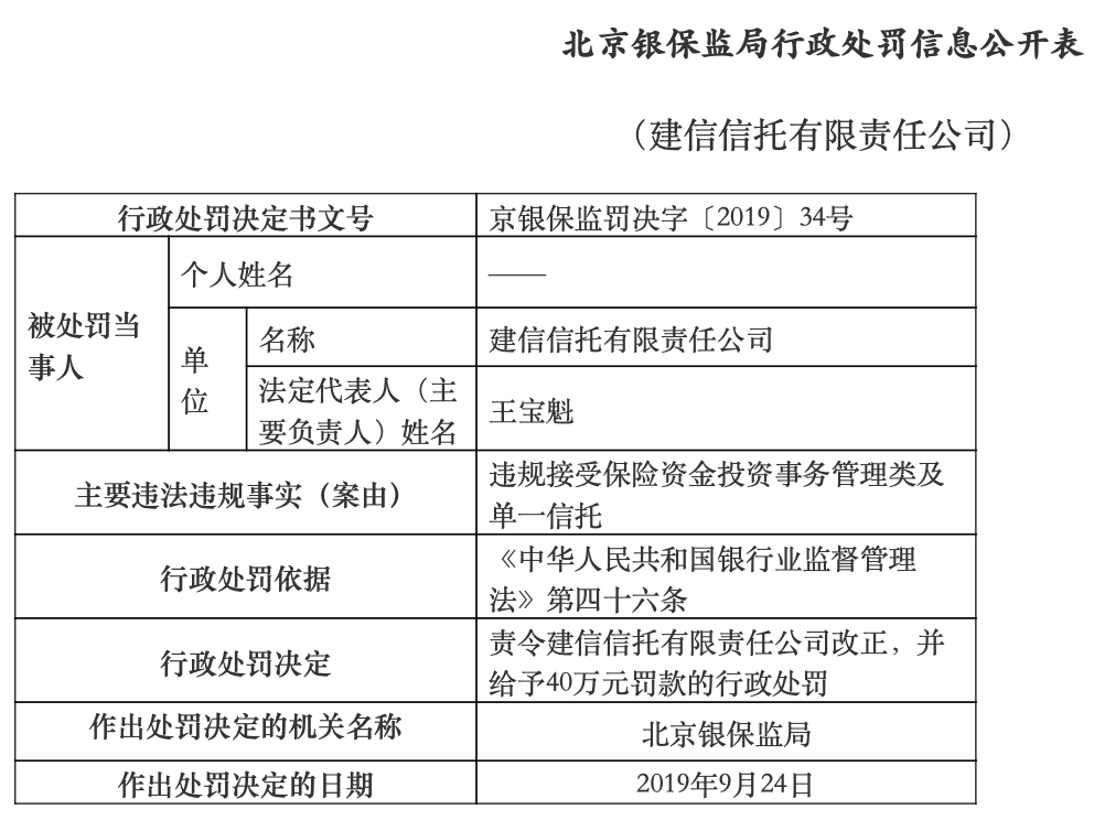 建信信托此次被罰原因為“違規接受保險資金投資事務管理類及單一信托”,監管責令其改正,並給予40萬元罰款的行政處罰,作出處罰決定日期為9月24日。