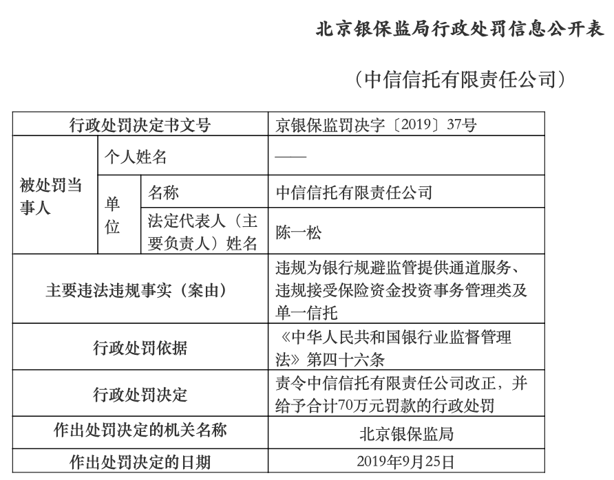 中信信托受罰是因為“違規為銀行規避監管提供通道服務、違規接受保險資金投資事務管理類及單一信托”,監管責令其整改,並給予合計70萬元罰款的行政處罰,作出處罰決定日期為9月25日。