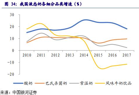 自2015年开始,国内消费者需求向低温奶等新细分领域转移,消费者开始追求新鲜、营养的乳品,越来越多的购买力转向了有机乳品、低温牛奶和成人奶粉。在这方面,蒙牛(02319-HK)和伊利(600887-CN)为主的乳制品生产商不断创新高端品牌,早期的特仑苏、金典,以及目前的安穆希、纯甄,都是随消费转变而面市的乳制品,品种花样,吸引了广大消费者。除此之外,蒙牛和伊利等企业亦加码风味牛奶业务,比如蒙牛推出的纯甄红枣枸杞风味酸奶大受市场欢迎。