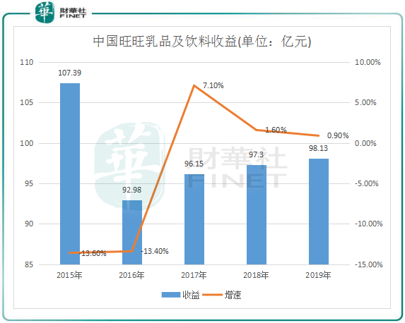 在过去十多年,中国旺旺的乳品及饮料板块销量增长迅速。2006年-2019财年,中国旺旺的乳品及饮料板块收入由约21.6亿元攀升至98.13亿元,增幅高达3.54倍,这主要受益于2005年-2015年期间风味奶、含乳饮料风靡市场的背景下带动的。