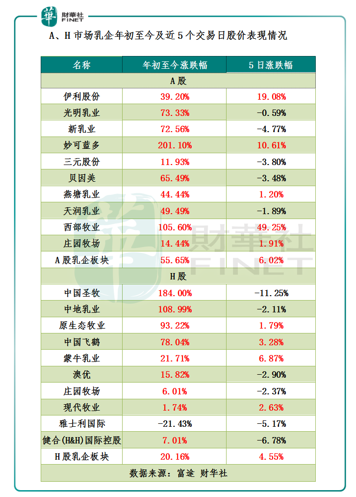 二级市场方面,随着二季度乳制品需求量的回升及国内刺激消费的影响,A、H两大市场乳企板块及上市乳企股价均出现不同程度反弹。年初至今,A股乳企板块涨幅为55.65%,其中涨幅最大的奶酪生产商妙可蓝多,其次是原料奶供应商西部牧业及新乳业;H股方面,年初至今港股乳企板块涨幅为20.16%,其中涨幅最大的为原料奶供应商中国圣牧,其次是原料奶供应商中地乳业及牛奶粉龙头飞鹤。