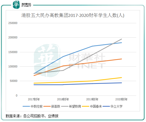 港股民办高教“三大巨头”中教控股(000839-HK)、希望教育(01765-HK)及新高教(02001-HK)过去几年来热衷于对外并购及自建校区,成功享受到了高职扩招政策的红利,在校生人数每年均有双位数增幅。其中希望教育在激进的外延式并购下,2020财年学生人数接近20万人,较2017财年翻近2倍,最新财报高增长的业绩也正是主要由于对外并购校网所驱动。