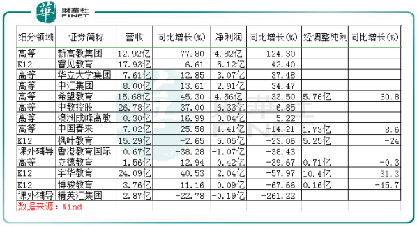 K12教育领域业绩表现则分化较大,其中宇华教育(06169-HK)经调整纯利同比增长率为31.3%;睿见教育(06068-HK)净利润有42.4%的高增长。枫叶教育(01317-HK)及博骏教育(01758-HK)净利润有较大幅度下滑。