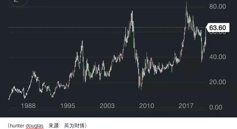 是自1985年以来hunter douglas的股价走势图,从波段的投资策略来看,这是一家非常优秀的企业,而从长期持有的角度来看,这家企业则容易使投资人陷入深深的焦虑之中。
