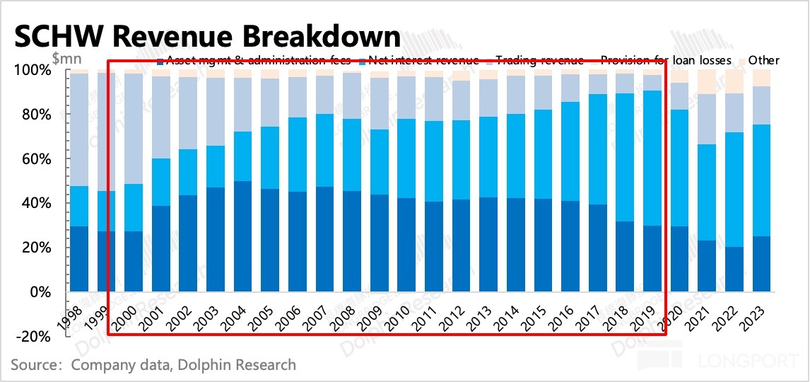 从 2000 年初收购信托公司开始,嘉信就开启了折扣互联网券商转型综合财富管理机构之路。而财富管理对嘉信的意义,不仅仅是降佣大趋势下的被迫转型,也是拓宽新客源、增加新创收的主动扩张。
