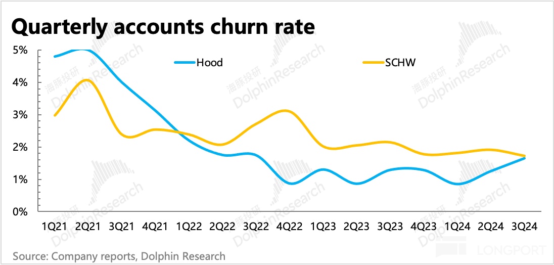 在 2021 年行业免佣化 + 疫情疯牛结束后,Robinhood 获客速度迅速下降,且弱于嘉信。
