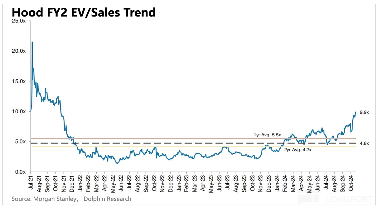 因此,短期上建议围绕估值区间来做相应的投资策略:从 2021 年上市以来,Hood 的中枢估值在 5x EV/Sales,目前已经达到近 10x,相对偏高。