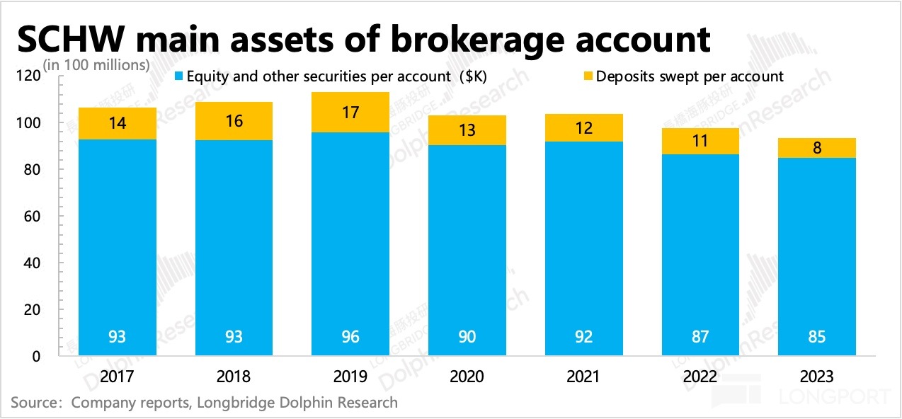 注意,上图中嘉信现在的单笔交易收入(佣金 +PFOF 收入),因为有线下交易的服务佣金、每张期权交易收取$0.65 费用、期货交易等,因此显得整体变现率高于 Robinhood。但后续随着交易线上化的迁移,以及其他证券品种降佣后,也会逐步向 Robinhood 的变现率水平靠拢。