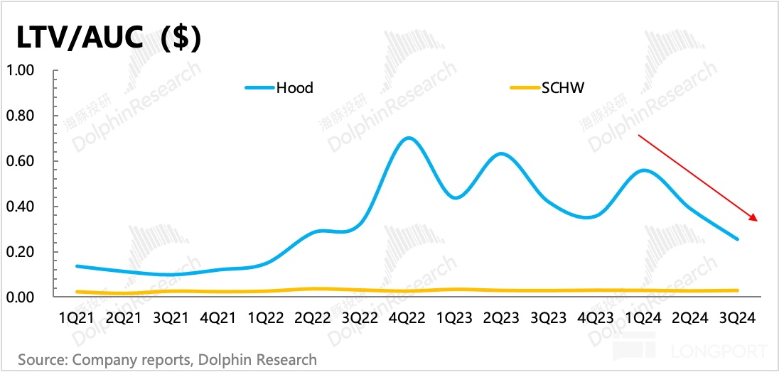 最终计算得的 LTV/AUC,Robinhood 要高于嘉信。但随着 Robinhood 开始推进财富管理等业务,这个变现价值也会顺应下降,但总价值会随着用户资产规模的增加而扩张。