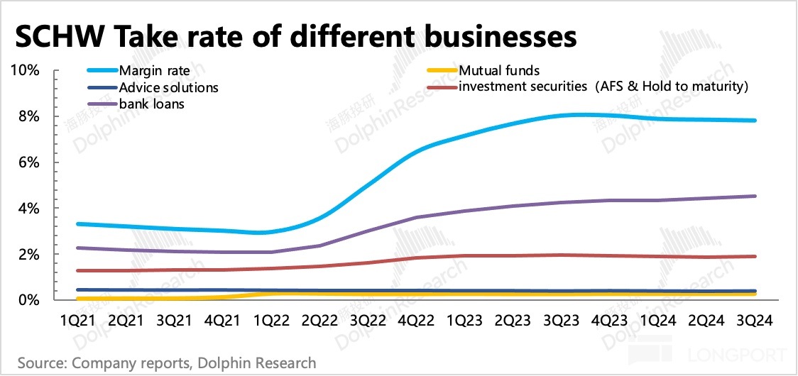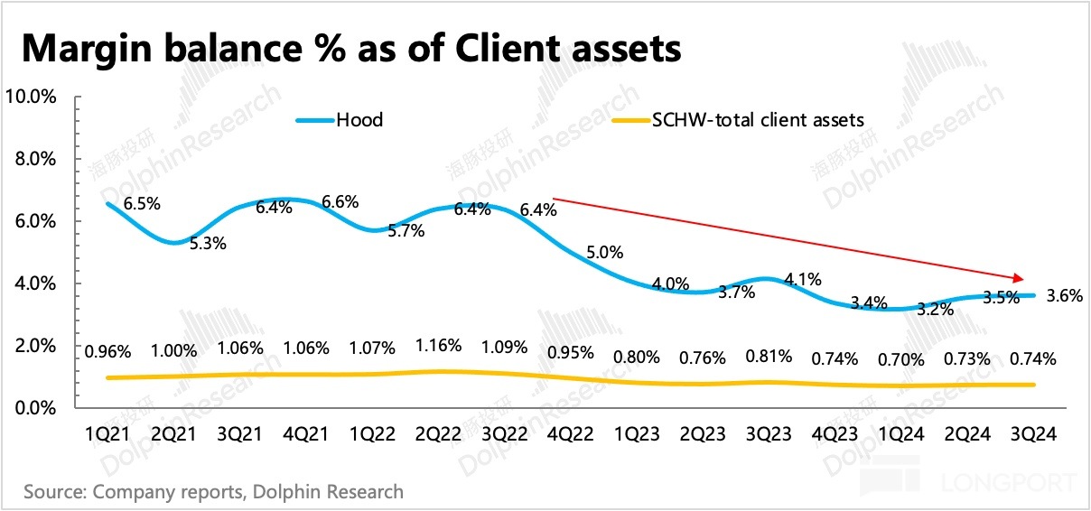 而海豚君推算下来,嘉信的融资业务收入占比也是 15%,对应贷款余额的收益率相比 Robinhood 还稍高一些,但为何嘉信却无法无限制拉高融资业务?