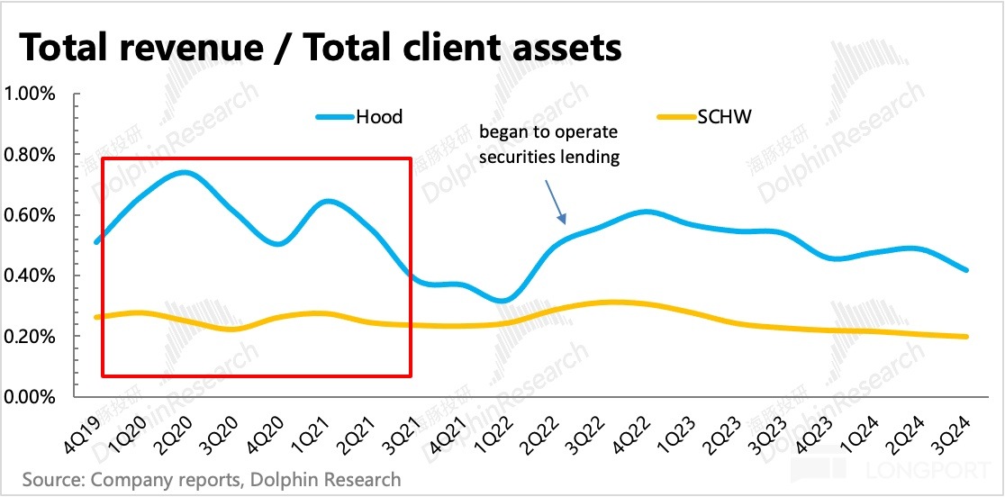 由于交易(含融资融券)的 take rate 比存款利息、财富管理、银行贷款等业务更高,因此 Robinhood 平均每一美元的客户资产,能够转化的收入也会更高一些。