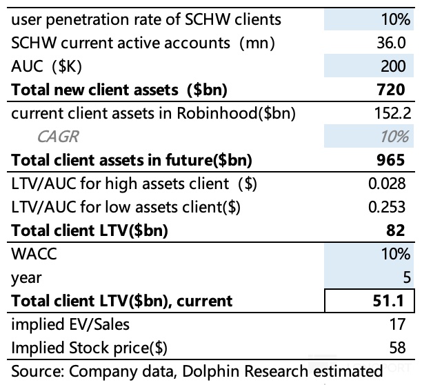 因此我们假设未来 Robinhood 形成了类似嘉信的金融业态,LTV/AUC 等同于当前嘉信的水平。那么对于 Robin hood 的估值,就成为了对 Robinhood 终局下能获得多少规模的用户资产的预测: