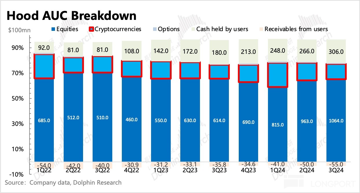 Robinhood 成功是靠零门槛的 AUM 和交易上手体验来获取小白用户。但 Robinhood 在 3Q24 获得的 10 万美金账户资金的新用户,并不完全对这些功能感兴趣。