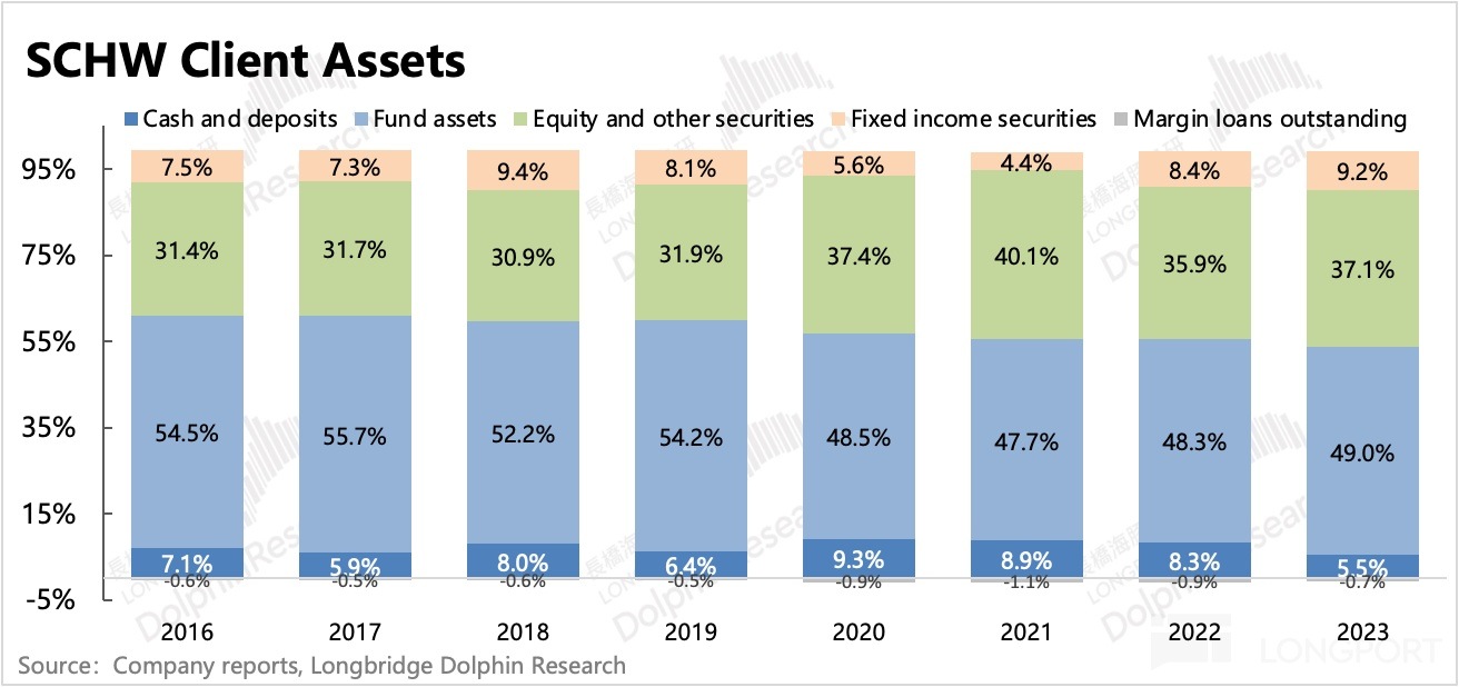 嘉信三季度为例,单客 25 万美元的资产购买配置上:50% 买基金,10% 买债等固收,以及不足 10% 的现金存款等,剩下真正用于自主股票投资的资产,只有 35% 左右,也就是对应近 9 万美金的资产。