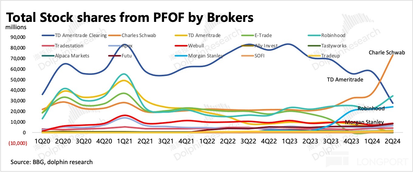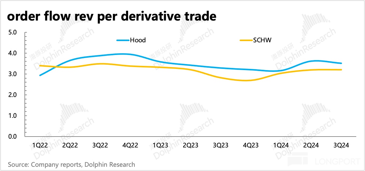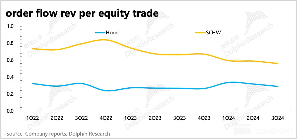 考虑到 Robinhood 的金融业相对简单,但还能在 2022-2023 年期间保持比嘉信更低的流失率,一定程度上能够反映出核心用户对 Robinhood 的认可和忠诚度,以及外部直接竞争不多,Robinhood 的品牌标签深入人心。不过 2024 年以来,流失率有所走高,可能体现为感受到的竞争变化。例如嘉信在 2024 年起交付给做市商的 PFOF 订单量和成交股数快速走高。