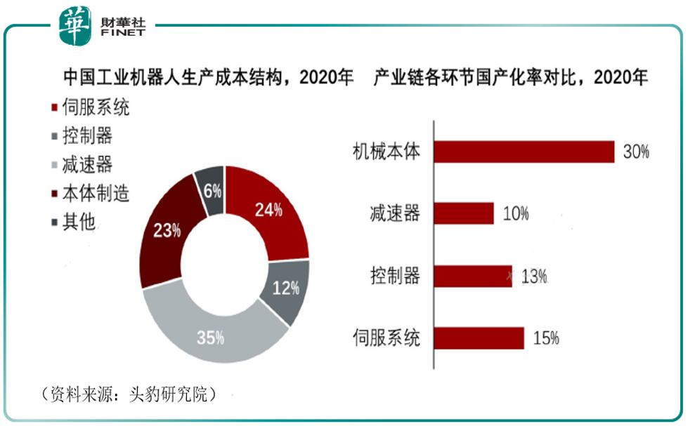 产业链上游:中国工业机器人生产成本结构中,上游核心零部件占比较高,伺服系统、控制器与减速器成本占比超70%,其中减速器行业壁垒极高,是国内工业机器人领域发展最薄弱的环节,截至2020年,减速器的国产化率只有10%,但生产成本却是最高,占到35%。