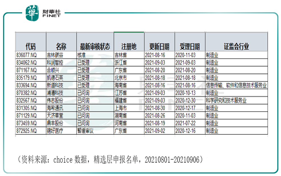 附录:笔者提取了近1个月(8月01日至9月06日)新三板精选层申报名单,情况如下,按证监会行业分类,制造业居多。