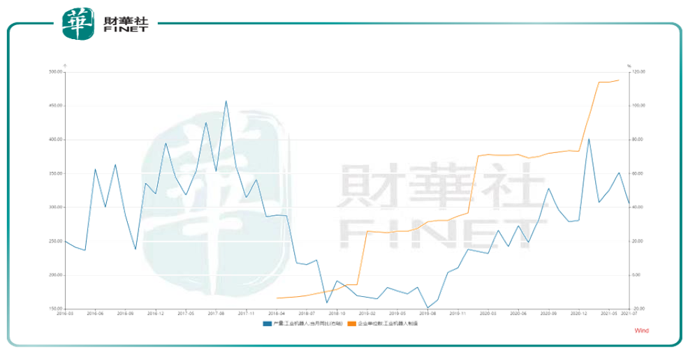 笔者查询WIND数据发现,属于工业机器人制造的企业数量,在近年快速增加(下图橙色曲线);而工业机器人制造的当月同比幅度,近两年也在快速上升(下图蓝色曲线)。